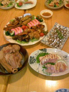 左から…豚骨の煮物、地鶏のお刺身、きびなごのお刺身。真ん中は、まぁ普通に(笑)おつまみ盛り合わせで~すo(^-^)o